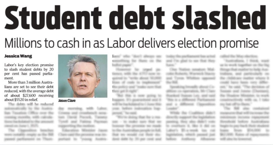 “More than 3 million Australians are set to see their debt reduced, with the average debt of about $27,600 receiving about $5520 in relief.” (Student debt slashed, 01/08).