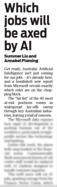 “Get ready, Australia: Artificial Intelligence isn’t just coming for our jobs – it’s already here, and a bombshell new report from Microsoft reveals exactly which roles are on the chopping block.” (Which jobs will be axed by AI, 01/08).
