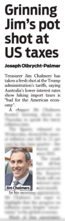“Treasurer Jim Chalmers has taken a fresh shot at the Trump administration’s tariffs, saying Australia’s lower interest rates show hiking import taxes is ‘bad for the American economy’.” (Grinning Jim’s pot shot at US taxes, 01/08).