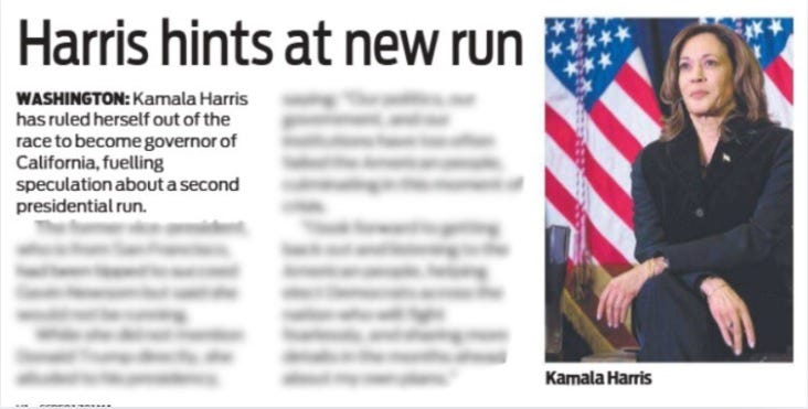 “Kamala Harris has ruled herself out of the race to become governor of California, fuelling speculation about a second presidential run.” (Harris hints at new run, 01/08).