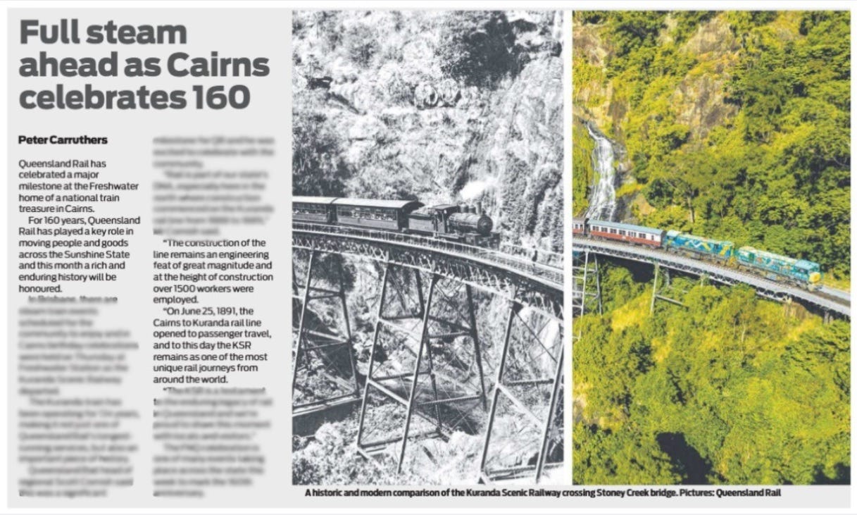 “On June 25, 1891, the Cairns to Kuranda rail line opened to passenger travel…”